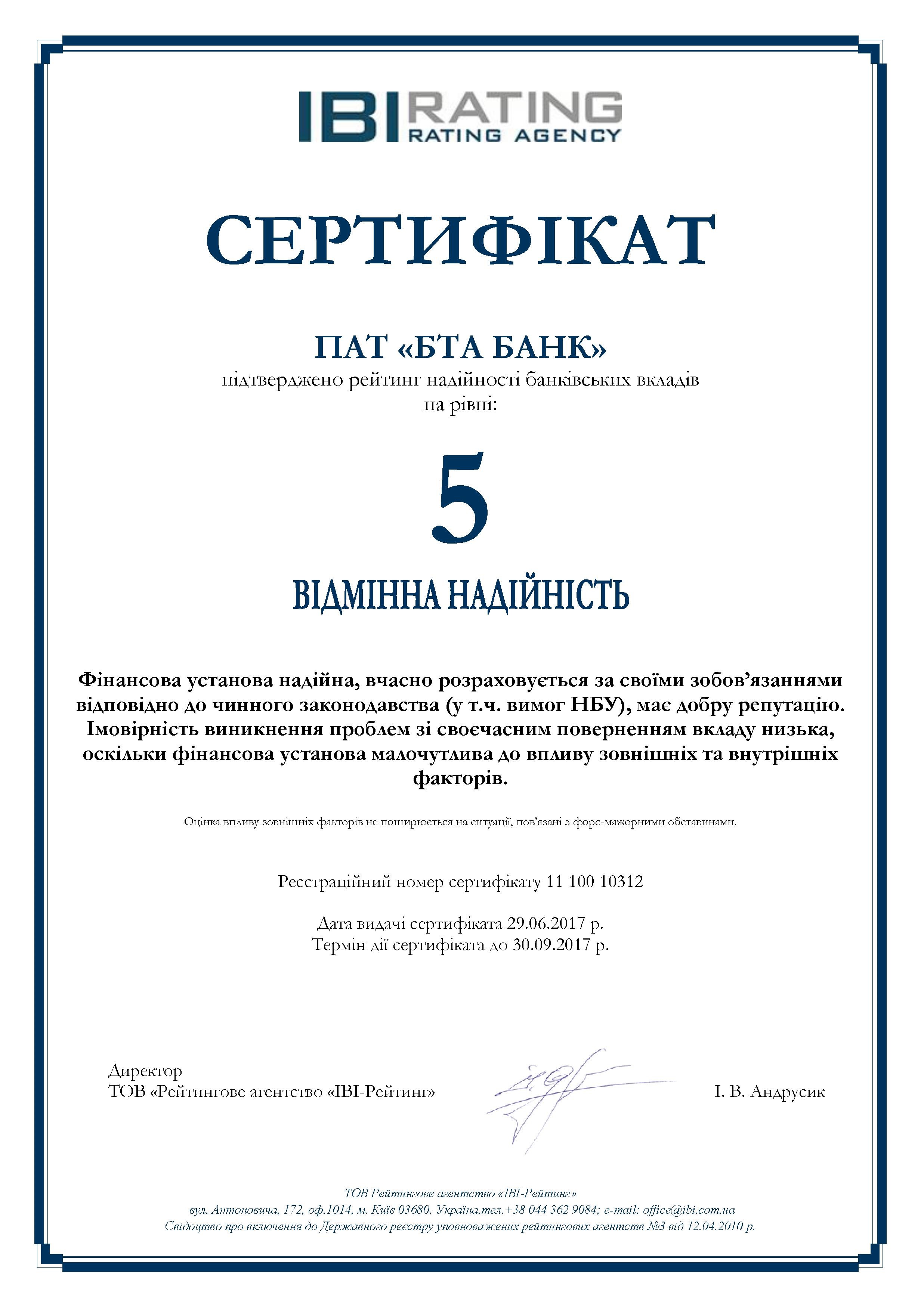 29 червня Національне рейтингове агентство IBI Rating підтвердило рейтинг надійності банківських вкладів БТА Банк на рівні «5» (відмінна надійність).