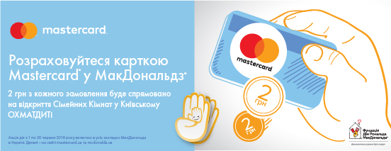 З 1 по 30 червня 2018 року розраховуйтеся Mastercard® у МакДональдз, і 2 грн з кожного замовлення буде спрямовано на відкриття Сімейних кімнат у Київському ОХМАТДИТі*.